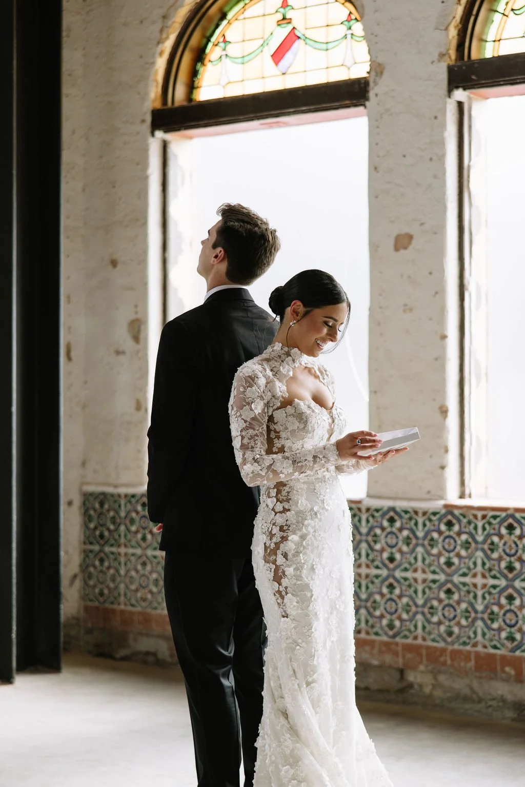Following the ceremony, guests traveled to another historic gem—Hotel Haya in Ybor City. Cocktail hour unfolded in Las Novedades, a space that feels distinctly European with its stained glass details, exposed brick walls, and warm, intimate ambiance.