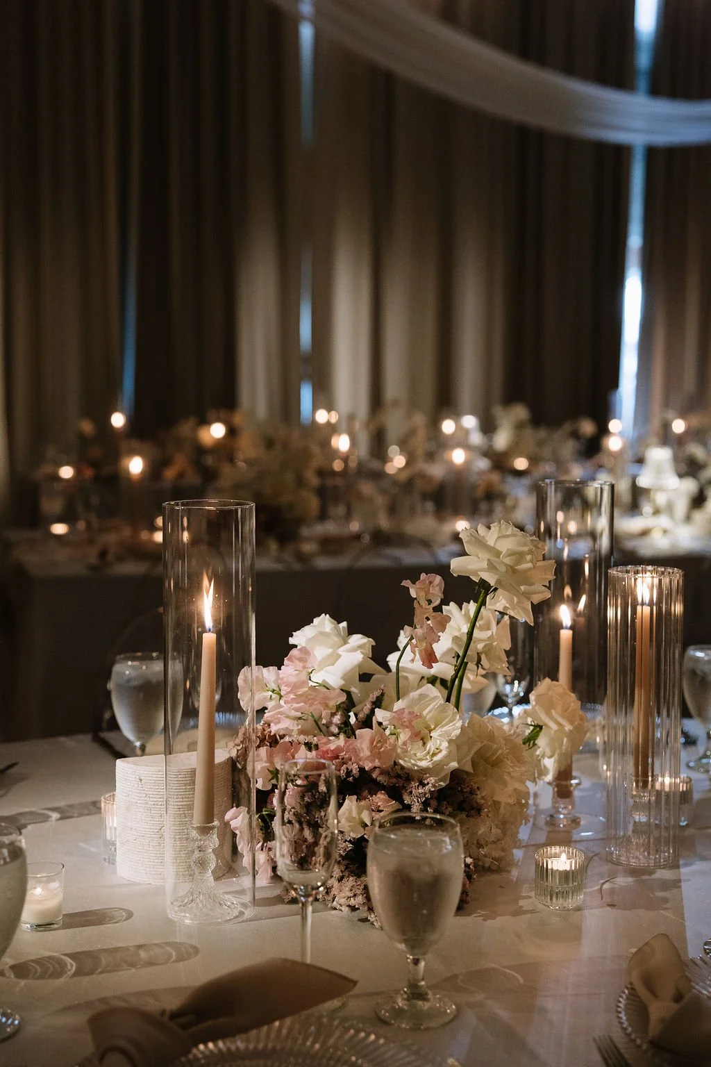 The dinner reception was held in the Valencia Ballroom. Working closely with FH Event Designs, we collaborated on a drapery installation that transformed the blank-canvas ballroom into Ally’s ethereal dream. To complement the drapery, we selected a palette of white, taupe, and the palest blush florals, layered with an abundance of candles, stone table numbers, and crystal ribbed charger plates . Ghost chairs added to the airy, light feeling of the room.We were the first to execute this drapery design at the venue, but after its popularity on Instagram, it quickly inspired other couples to adapt it for their own events.