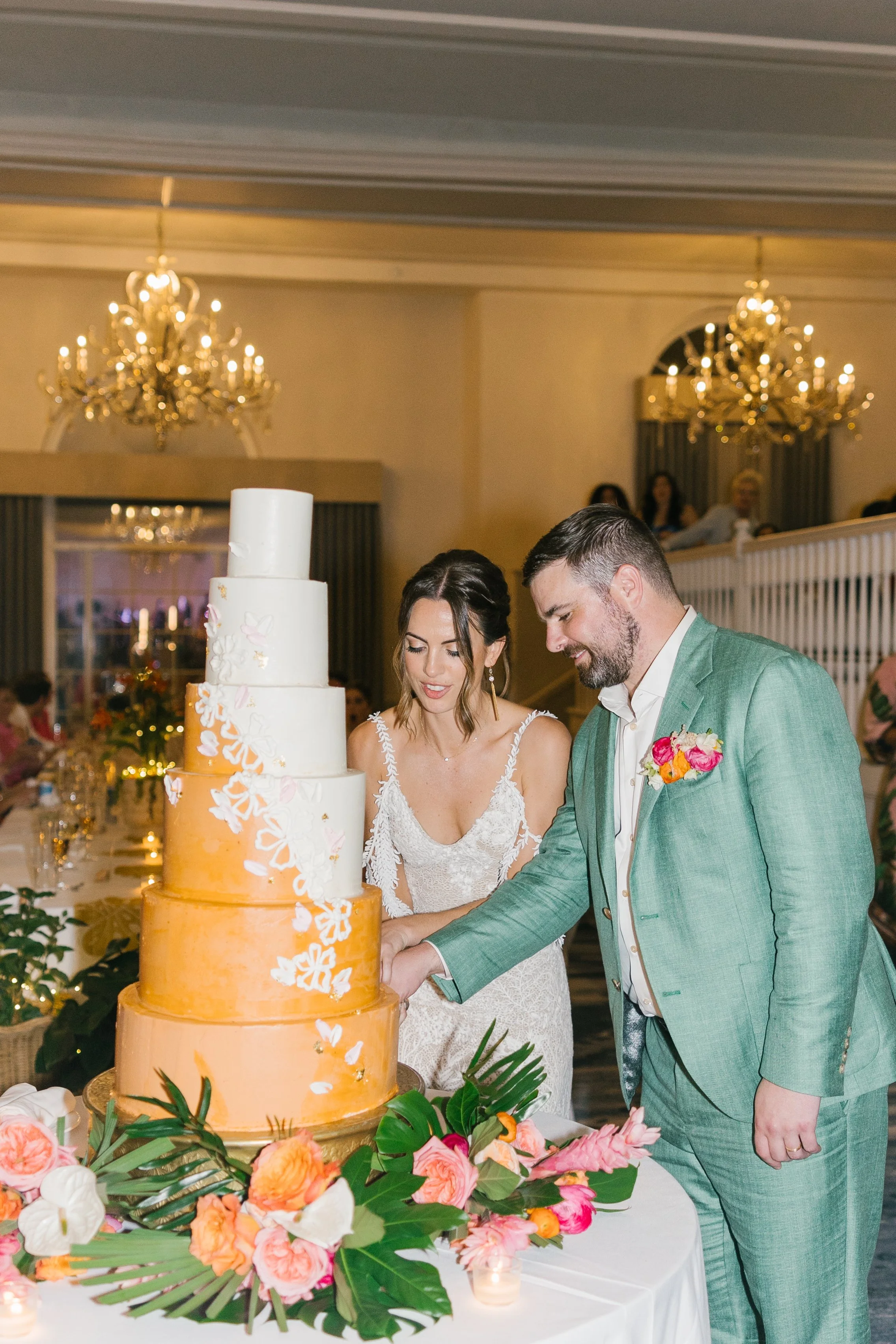 The ceremony took place in the garden space with the pink place as the backdrop. Following the ceremony, guests joined cocktail hour on the hotel veranda for breathtaking sunset views and live music. The dinner reception took place in the Grand Ballroom. Hand painted linens and shell embellised vases for tropical orochids dressed the tables and each guest was surprised to find a photo at their place setting of them with either the bride or the groom. The ballroom felt grand and intimate at the same time.